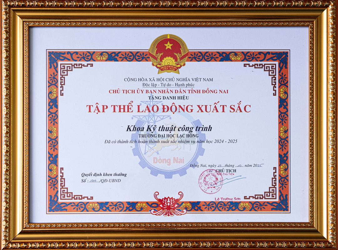 Với những đóng góp xuất sắc và vượt trội trong năm học 2024-2025, tập thể Khoa KTCT đã vinh dự đón nhận Bằng khen Tập thể Lao động Xuất sắc do Ủy ban Nhân dân tỉnh Đồng Nai trao tặng. Đây là phần thưởng cao quý ghi nhận tâm huyết của đội ngũ cán bộ, giảng viên trong việc nâng cao chất lượng giáo dục tại địa phương.