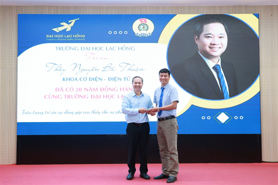 Tại buổi lễ, Công đoàn Trường đã tổ chức tri ân 73 NGNLĐ có thời gian công tác đạt các mốc 10 năm, 15 năm, 20 năm và 25 năm (tính đến năm 2025). Hoạt động tri ân nhằm ghi nhận và tôn vinh những đóng góp bền bỉ, lâu dài của đội ngũ NGNLĐ đã gắn bó, đồng hành cùng Trường Đại học Lạc Hồng trong suốt quá trình xây dựng và phát triển.