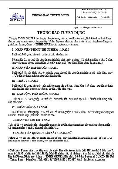 CÔNG TY TRÁCH NHIỆM HỮU HẠN OKURA tuyển dụng nhân viên phòng thí nghiệm chuyên ngành Môi trường,